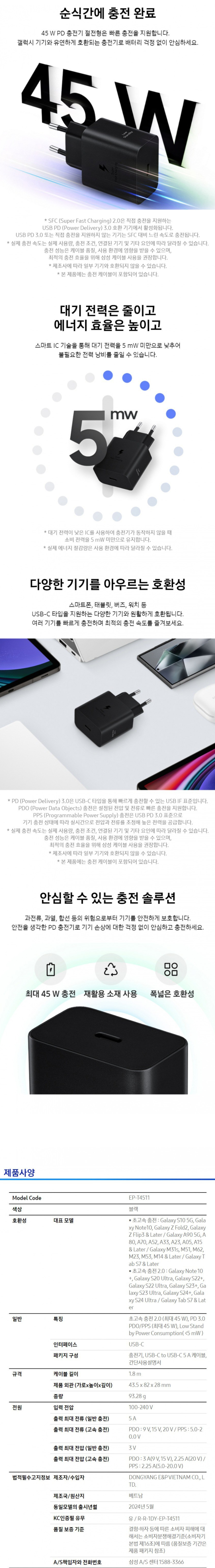 ★삼성전자★ 45W PD 초고속 충전기 절전형 + USB C to C 케이블 1.8m 세트