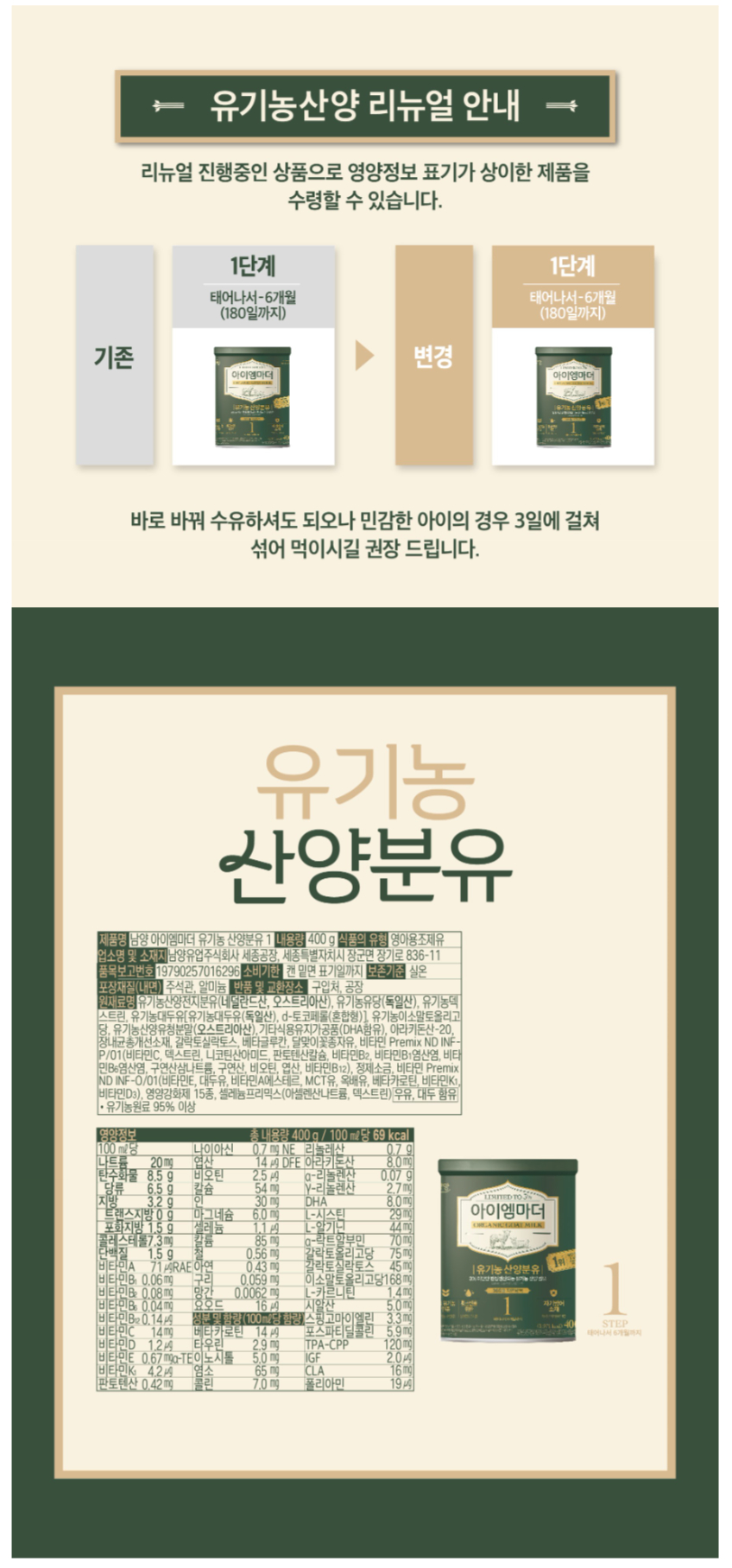 ★남양★ 유기농 산양분유 1단계, 400g, 1개