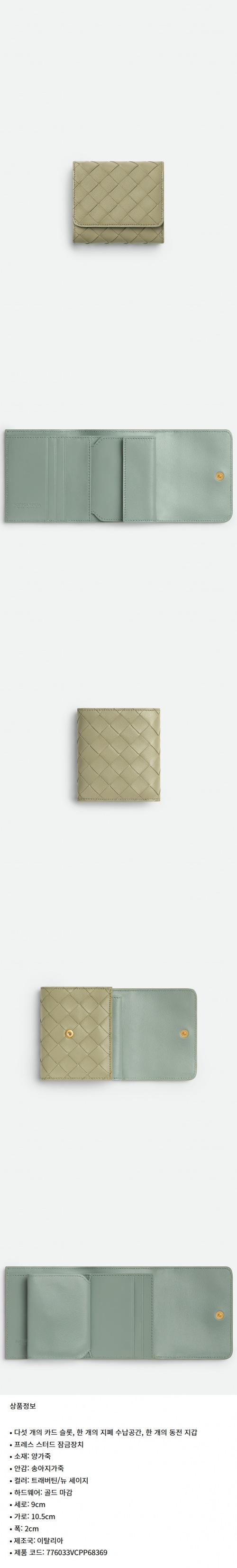 ★BOTTEGA VENETA★오리가미 동전 지갑이 있는 인트레치아토 3단 폴더형 지갑 트래버틴/뉴 세이지